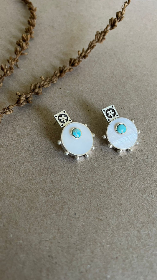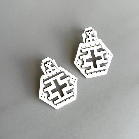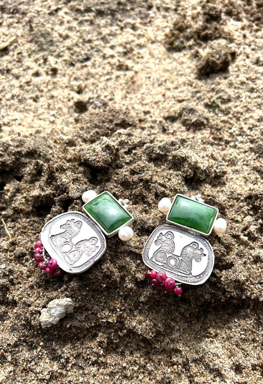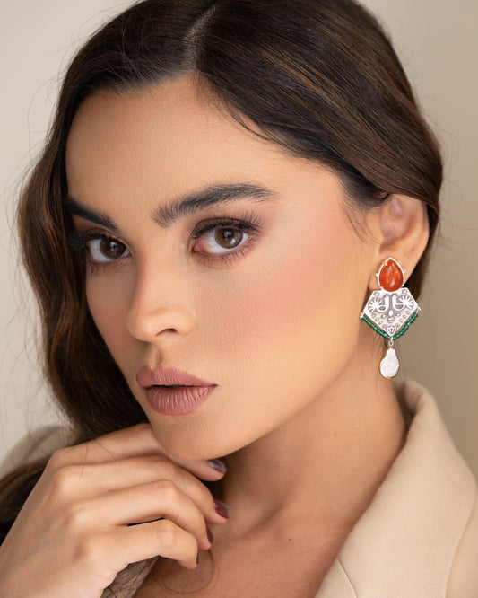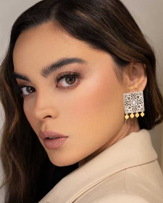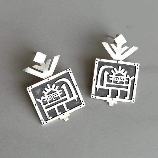 Square-shaped silver earrings with stone and cypress design, crafted by Zargoon