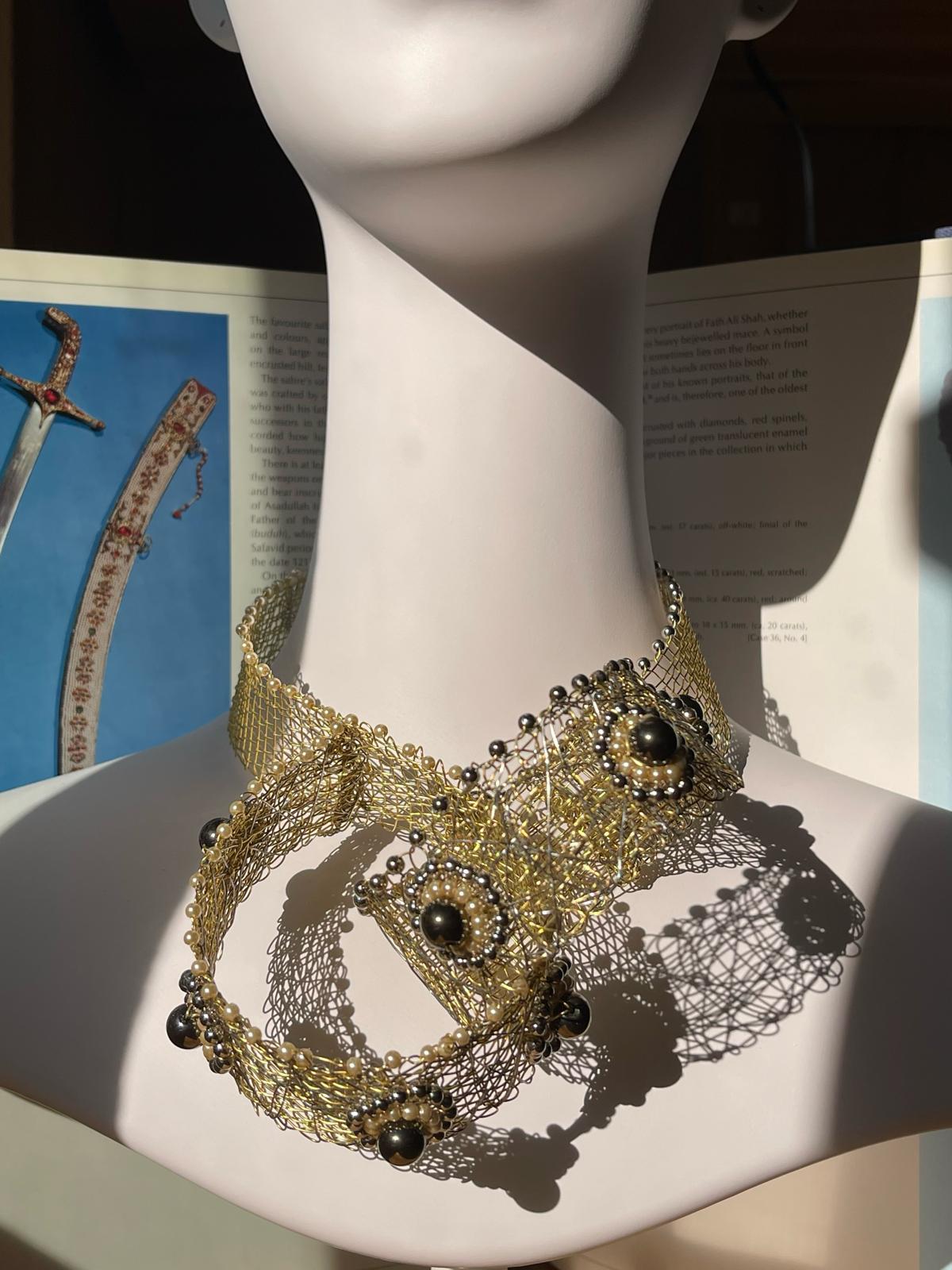 Artisan Brass Necklace with Hematite, Steel Beads & Pearls by Sareh Ghomi