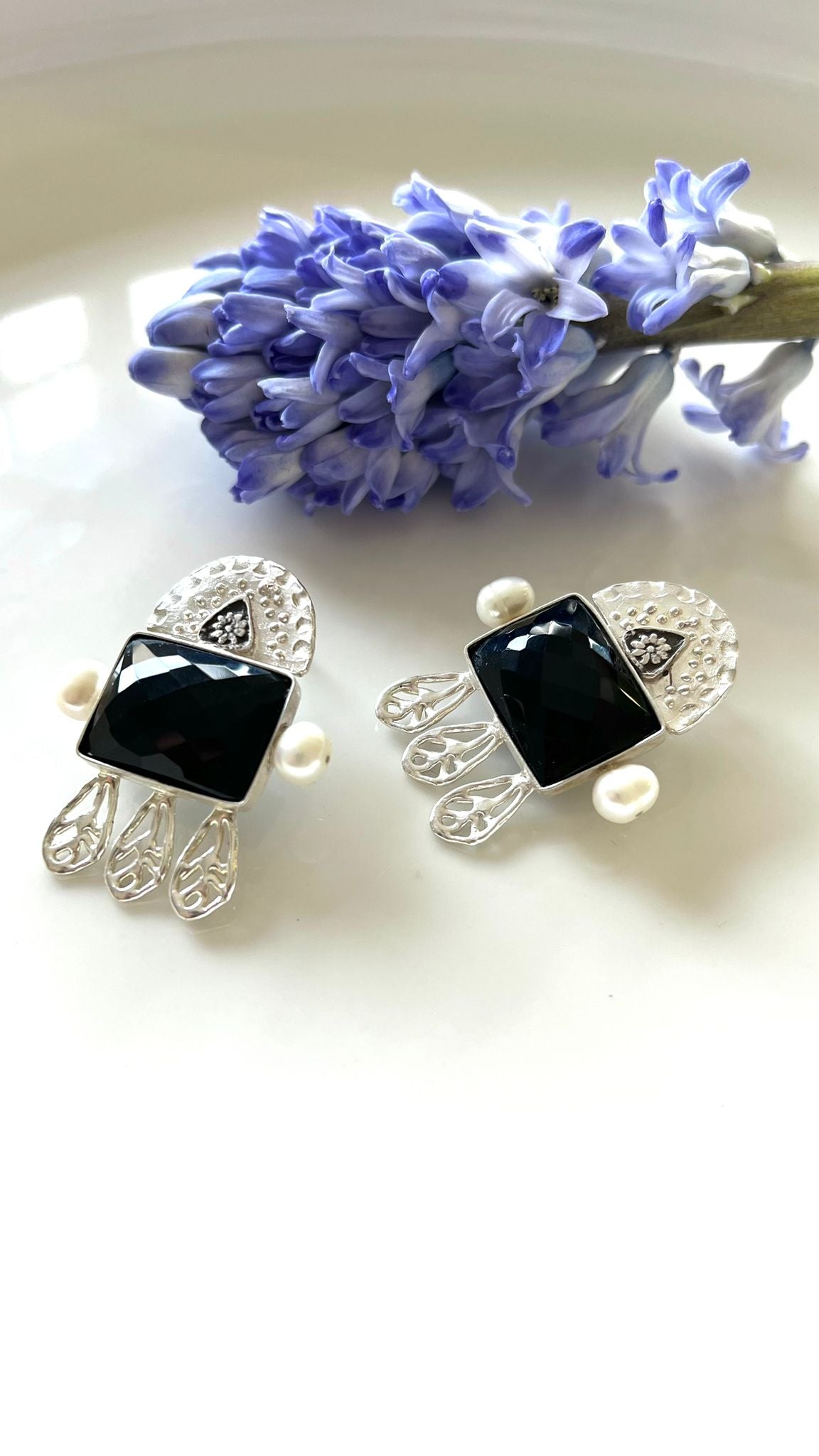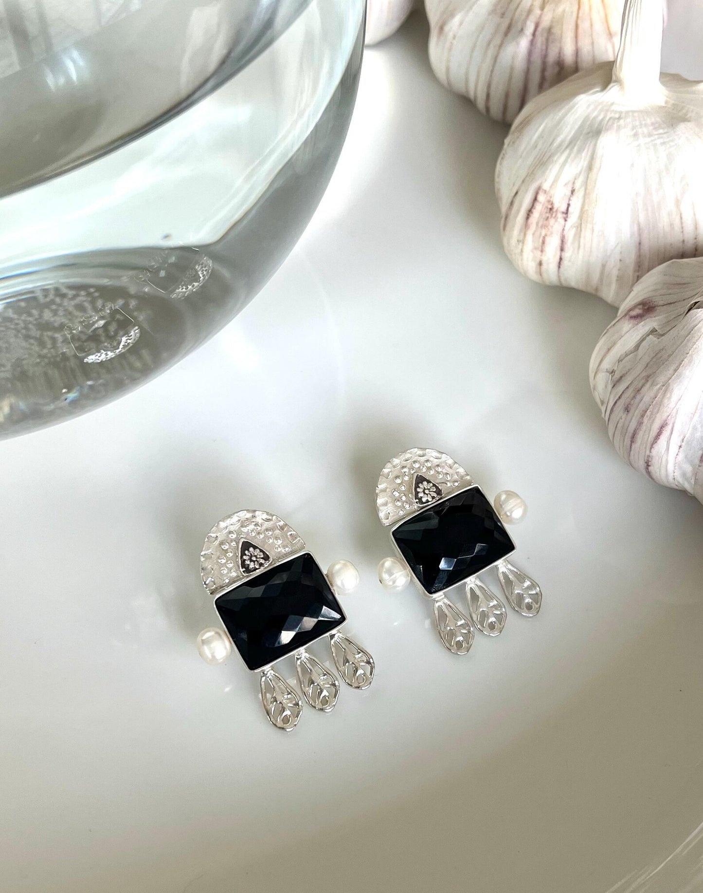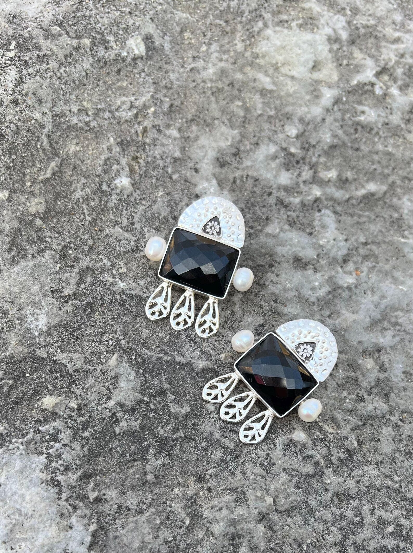 Silver Midnight Bloom Handmade Earrings by Maryam Khazali (Silver, Onyx and Pearl)