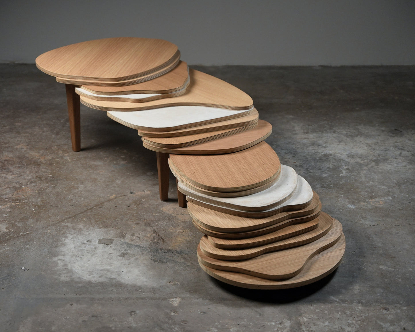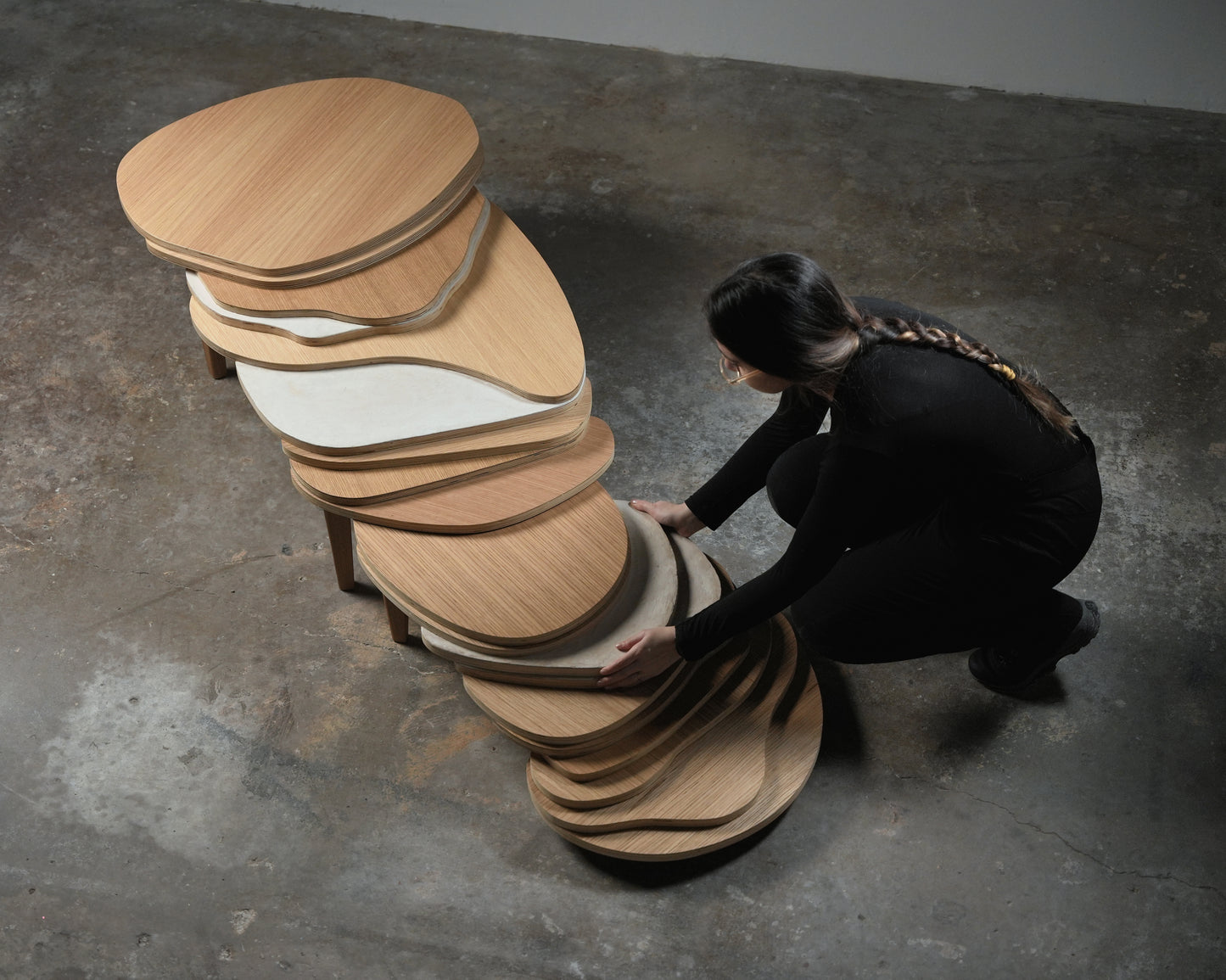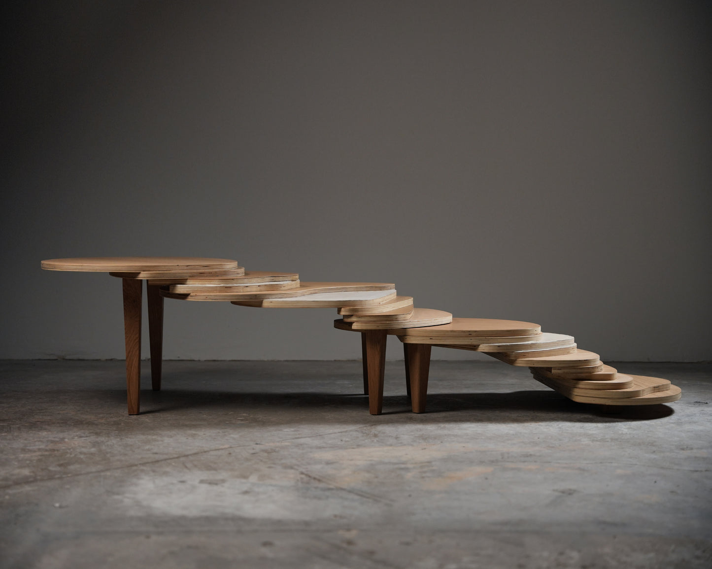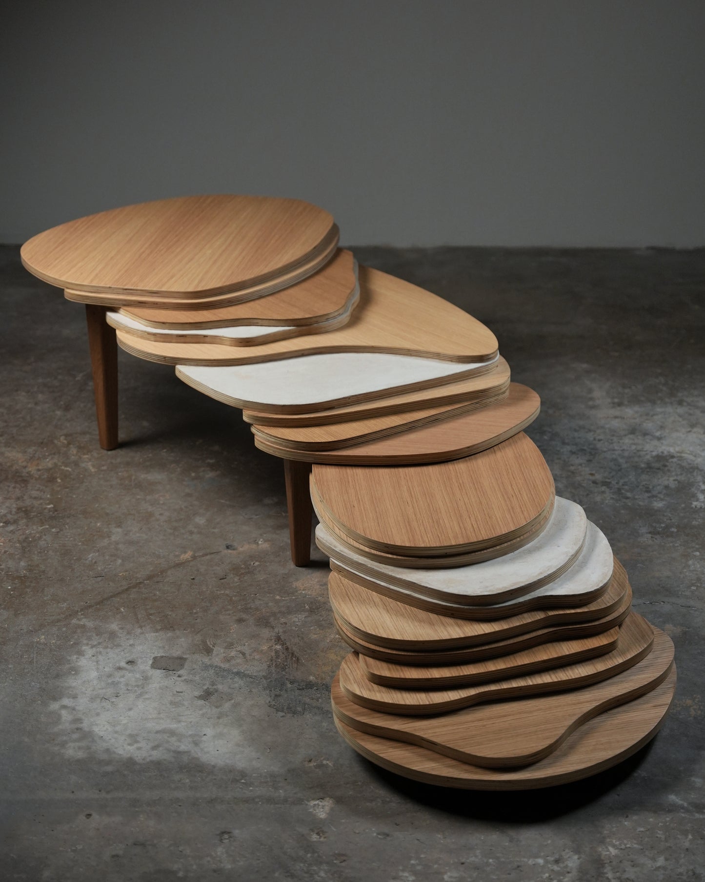 This coffee table design is a tribute to the natural ravines that thread through the city, forming a powerful connection between urban life and the river flowing below. The stepped layers of the table mimic the steep contours of the landscape, embodying the transition from the heights of the city to the depths of the ravine. Each tier offers a unique and functional surface, inviting users to interact with the design in a way that mirrors the layered complexity of nature.